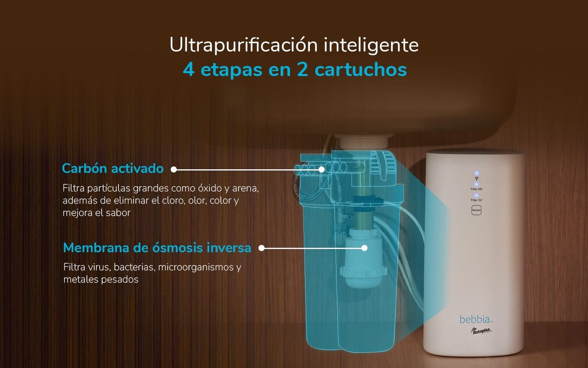 Olvídate de los sistemas voluminosos. Descubre cómo un purificador de agua compacto, como bebbia Smart, ofrece tecnología avanzada, 4 etapas de purificación y monitoreo por app sin sacrificar espacio ni calidad.